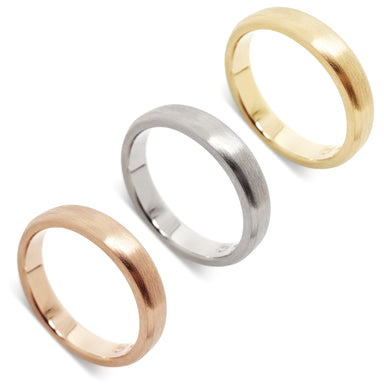 Orion | Handcrafted 14k gold flat wedding ring with a rolled edge and a hand brushed finish. Handcrafted 14kt gold flat wedding ring with a roll...