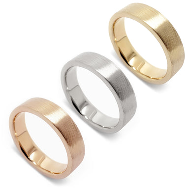 Orion | Handcrafted 14k gold flat rolled edge wedding ring. Handcrafted 14kt gold wedding ring with a flat rolled edge profile and a hand brus...