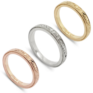 Natura | Handcrafted 14k gold wedding ring with hand engraving and millgrain. Handcr...