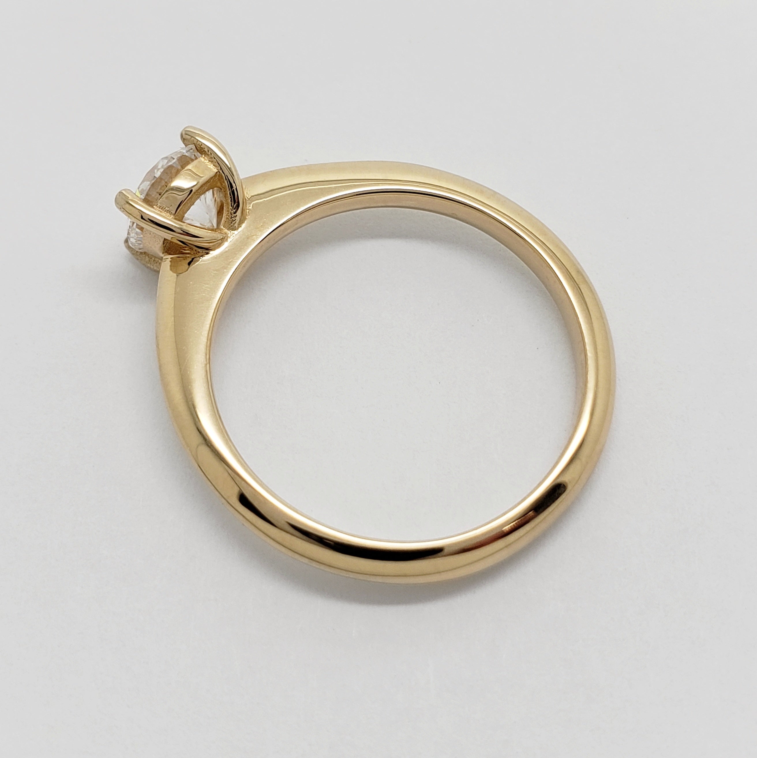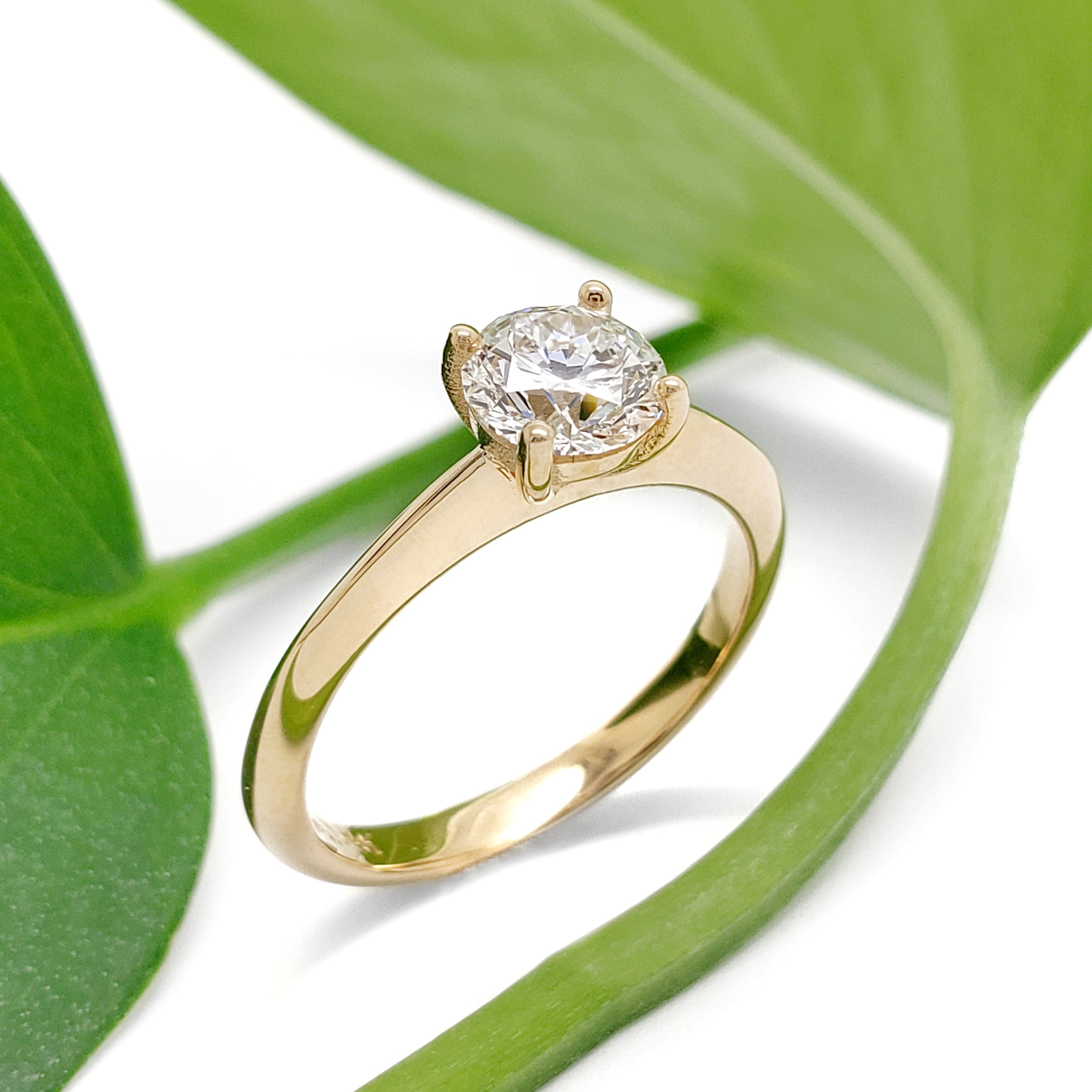 Handcrafted 14kt yellow gold ethical engagement ring set with a beautifully sparkling lab grown diamond in a simple four-claw setting.