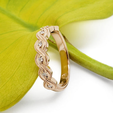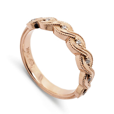 Iclyn Rose | Handcrafted 14k rose gold diamond wedding ring with twisted millgrain detail. This handcrafted 14k rose gold wedding band features...