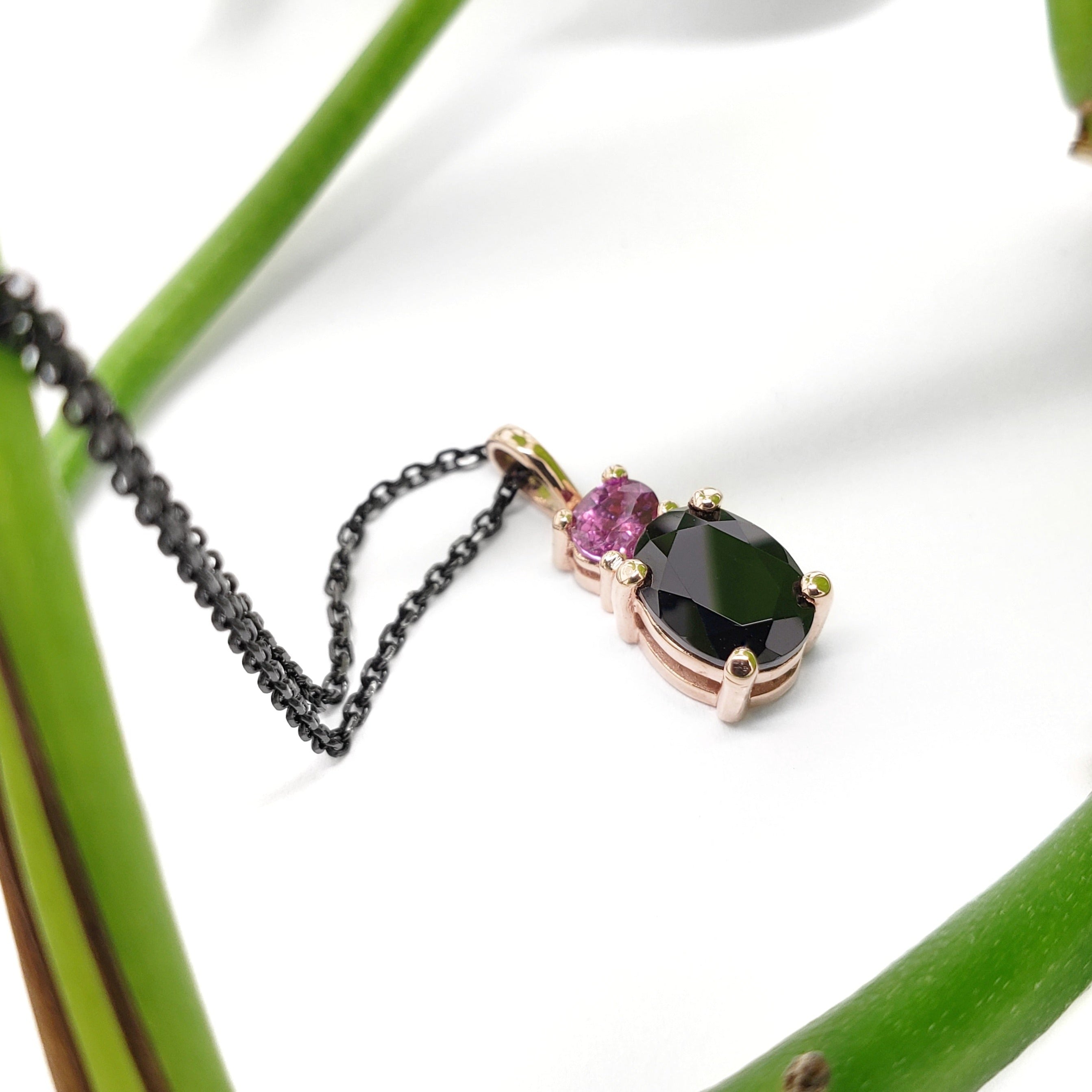 Handcrafted 14kt rose gold custom pendant set with a saturated pink sapphire and black spinel.