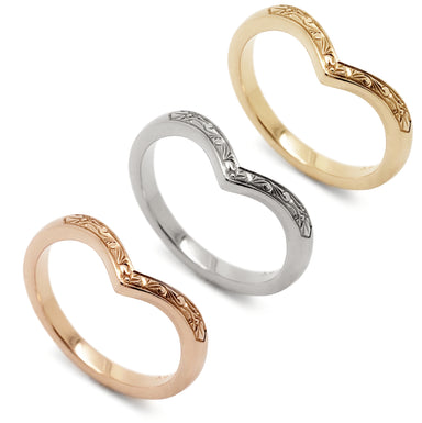 Audie Yellow | Handcrafted 14kt yellow gold chevron wedding ring with hand engraving. Handcrafted 14kt yellow gold unique wedding ring with a c...