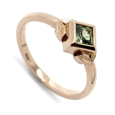Encircle | 14kt rose gold engagement ring with a princess cut lab grown sapphire and leafy details. Handcrafted 14kt rose gold unique engagem...