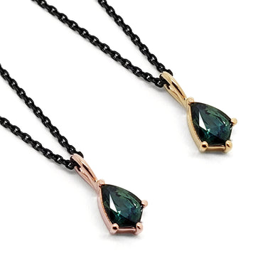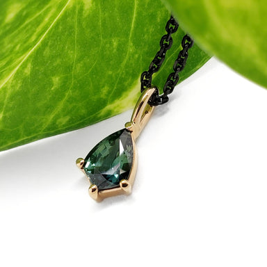 Shield Pendant | 14kt gold pendant with a shield cut green sapphire. Handcrafted 14kt gold necklace featuring deep green shield cut sapphire....