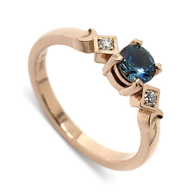 Madeline | 14kt rose gold engagement ring set with a blue Montana sapphire and Canadian diamonds. Handcrafted 14kt rose gold ethical engage...