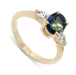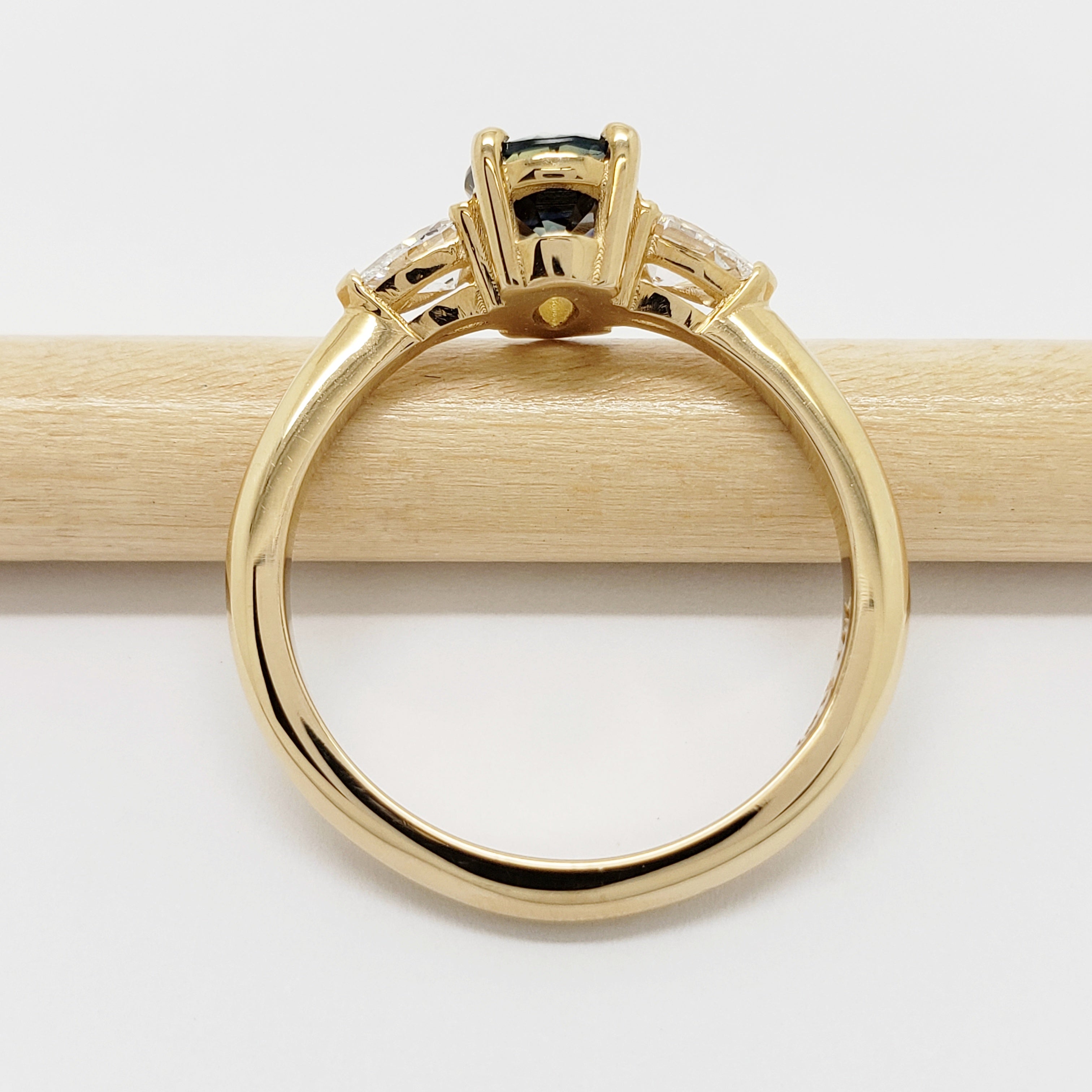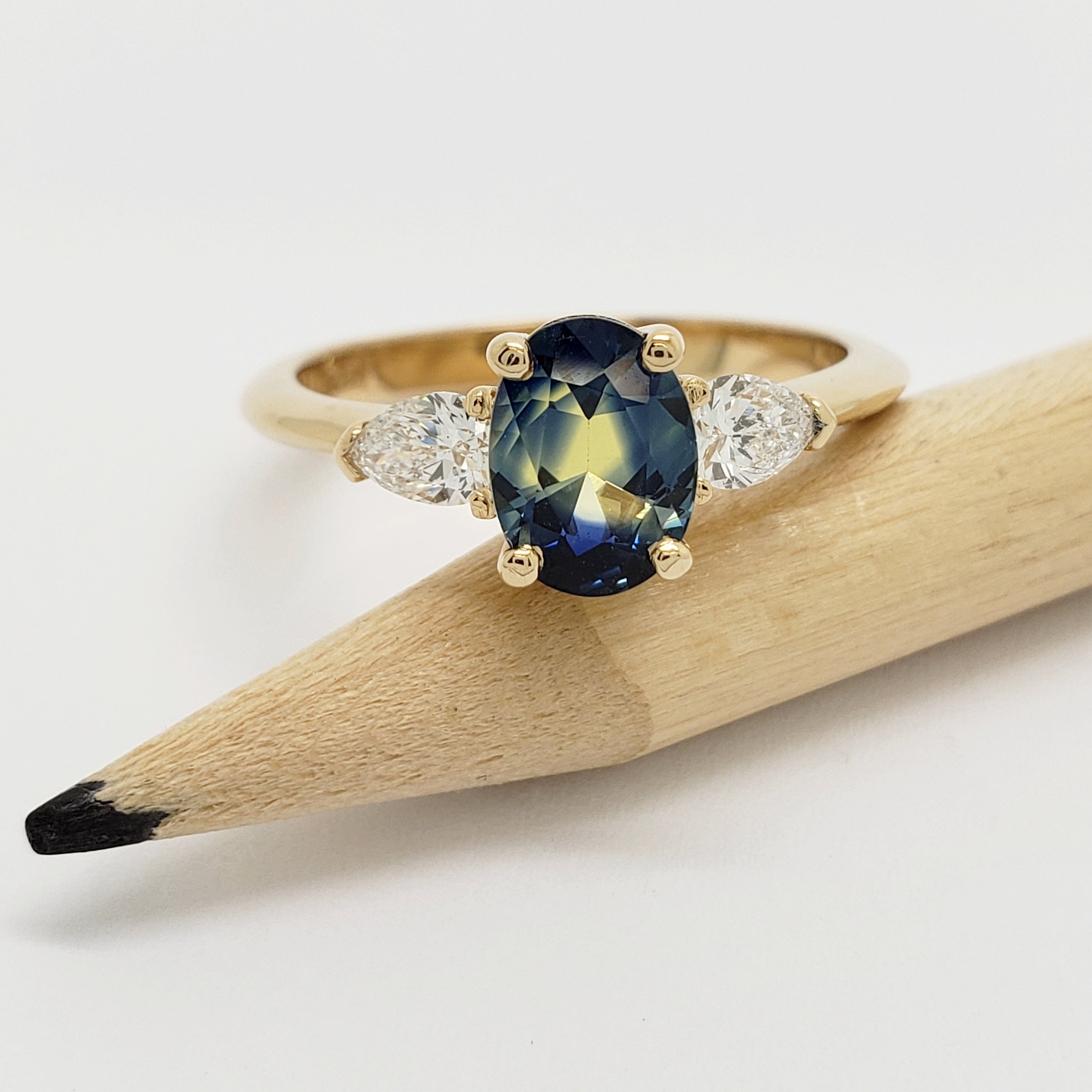Handcrafted 14kt yellow gold custom 3-stone engagement ring, with an oval cut deep blue Australian sapphire and two pear cut lab grown diamonds.