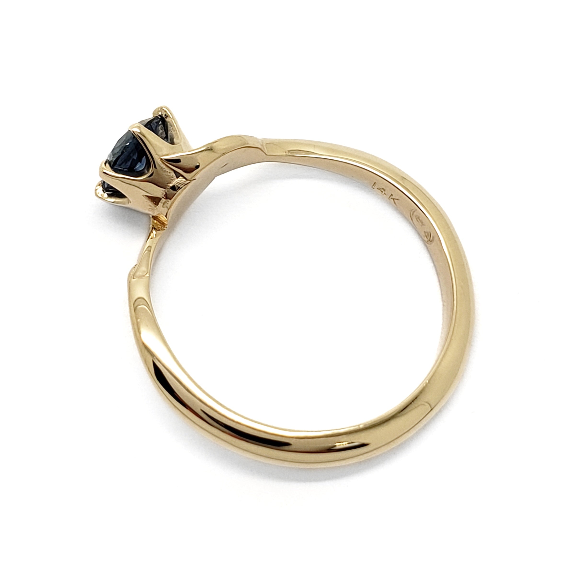 Handcrafted 14kt yellow gold ethical engagement ring with a 6-claw set 0.89ct round Montana sapphire in a deep blue hue. This unique engagement ring has a slightly tapered, high polished band with natural leaf details next to the centre stone.