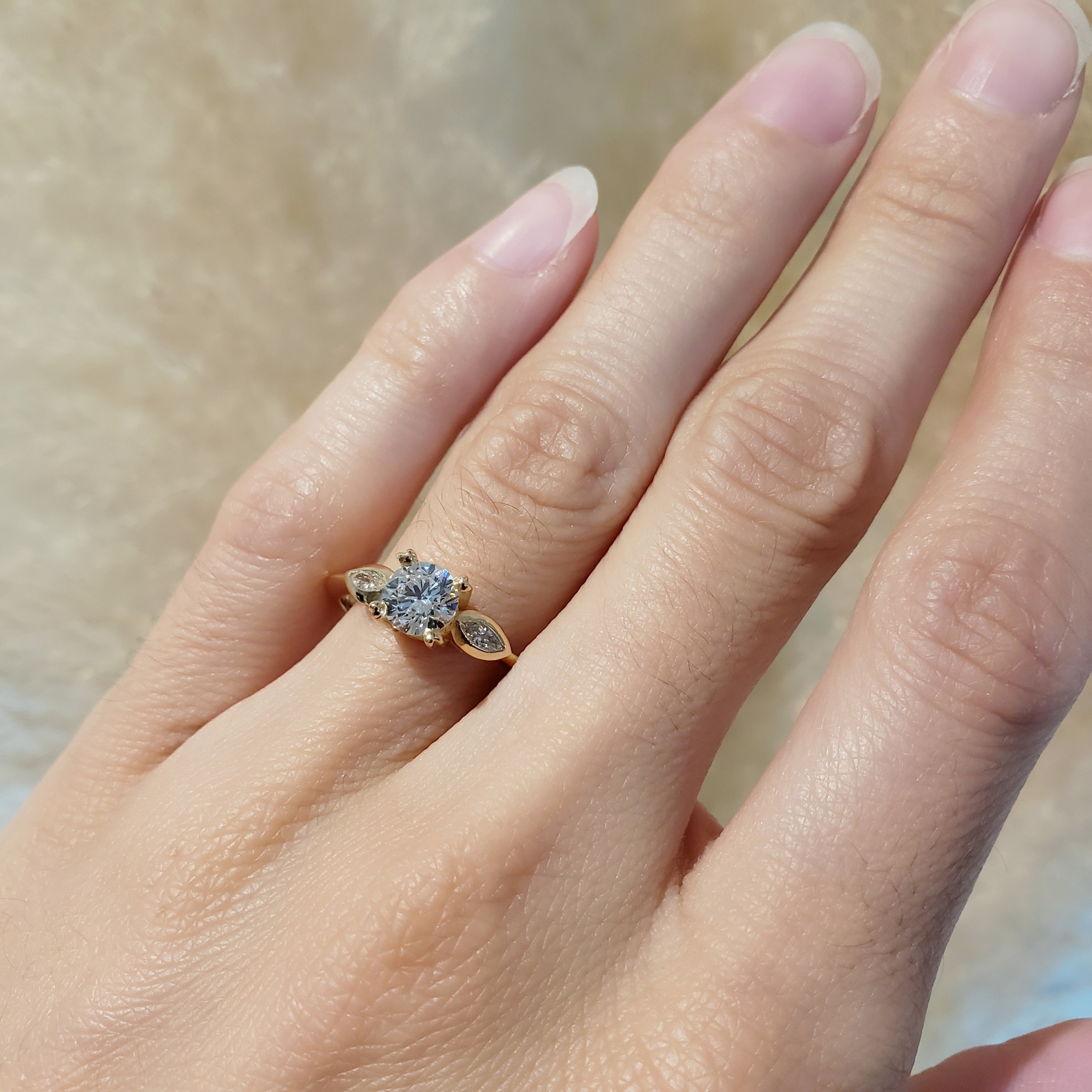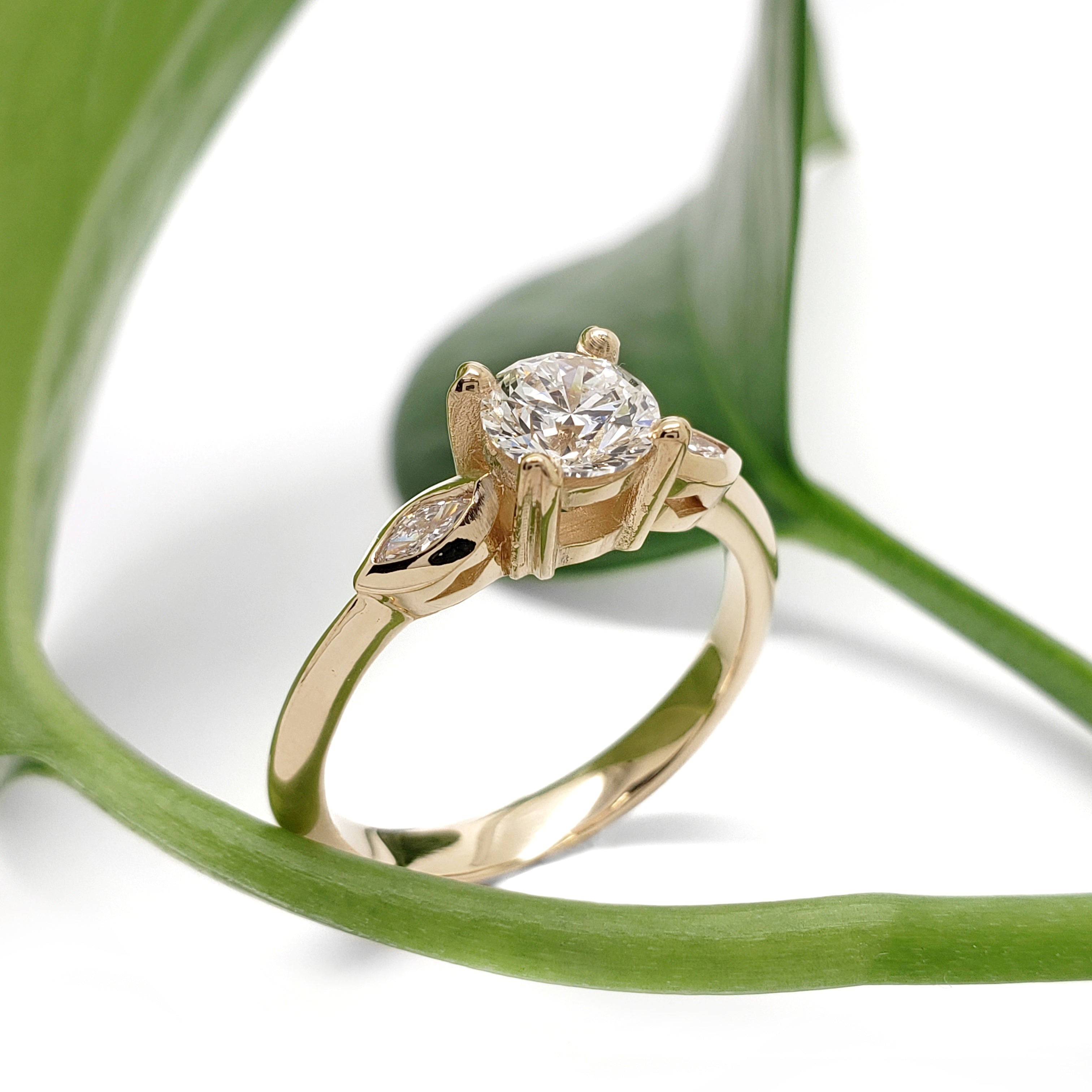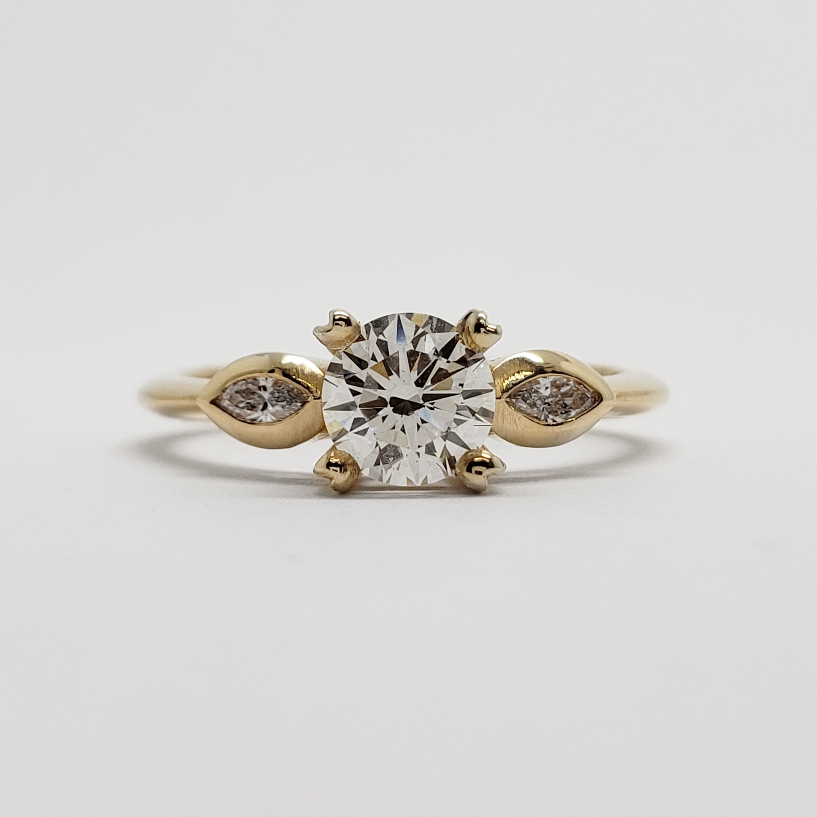 A larger version of our classic Petale ring, this handcrafted 14kt yellow gold custom engagement ring features a 0.75ct round brilliant lab diamond framed by two marquise cut lab diamonds.
