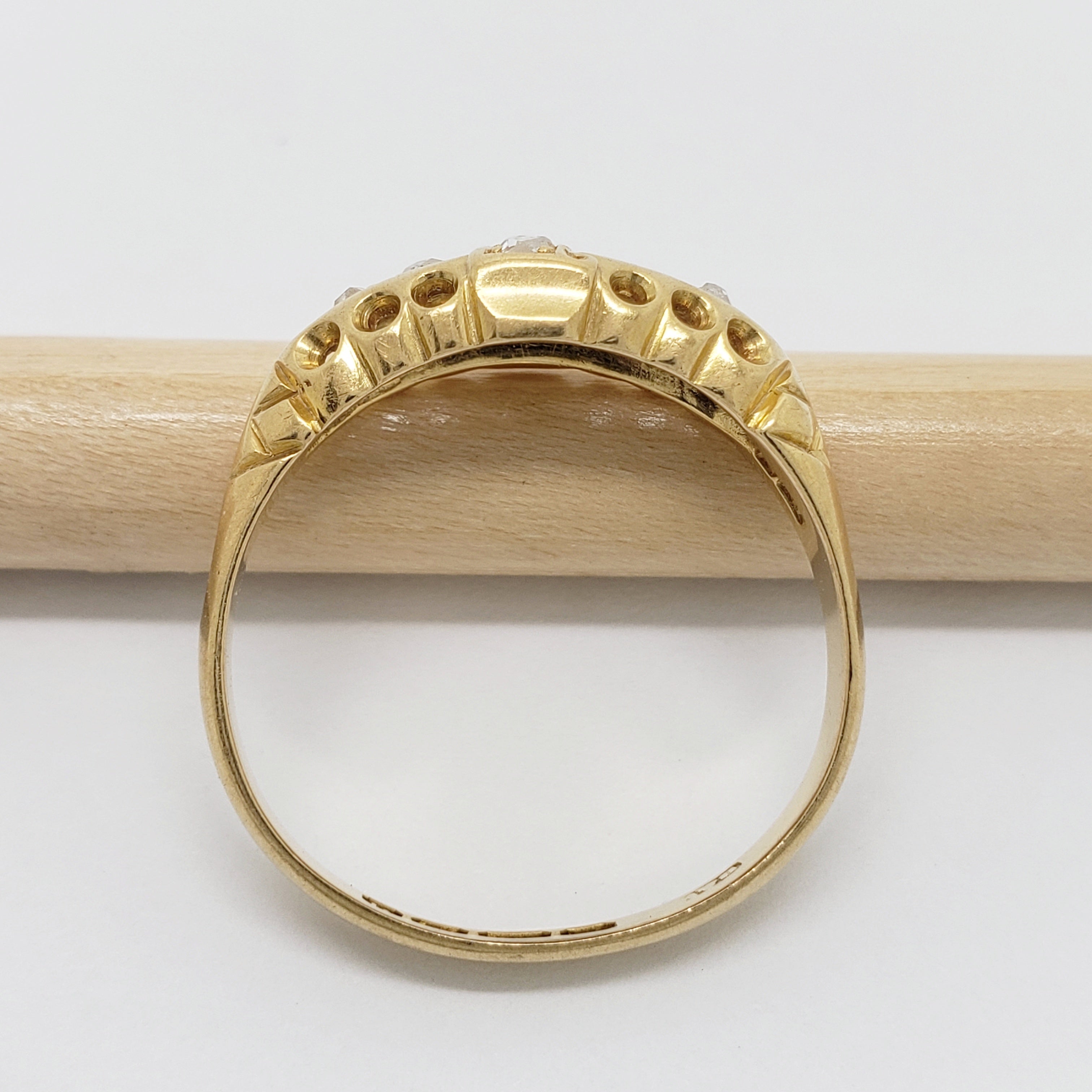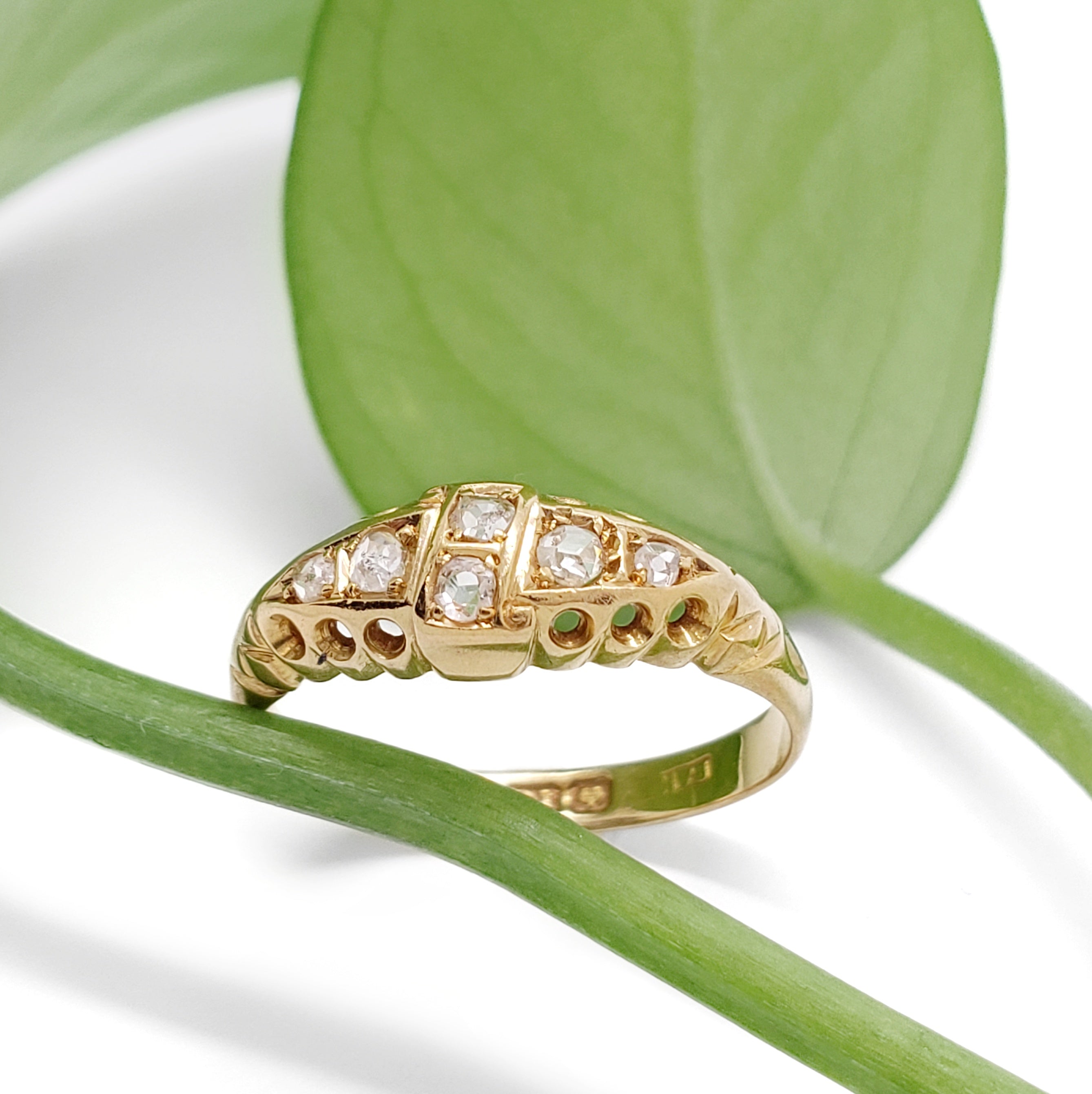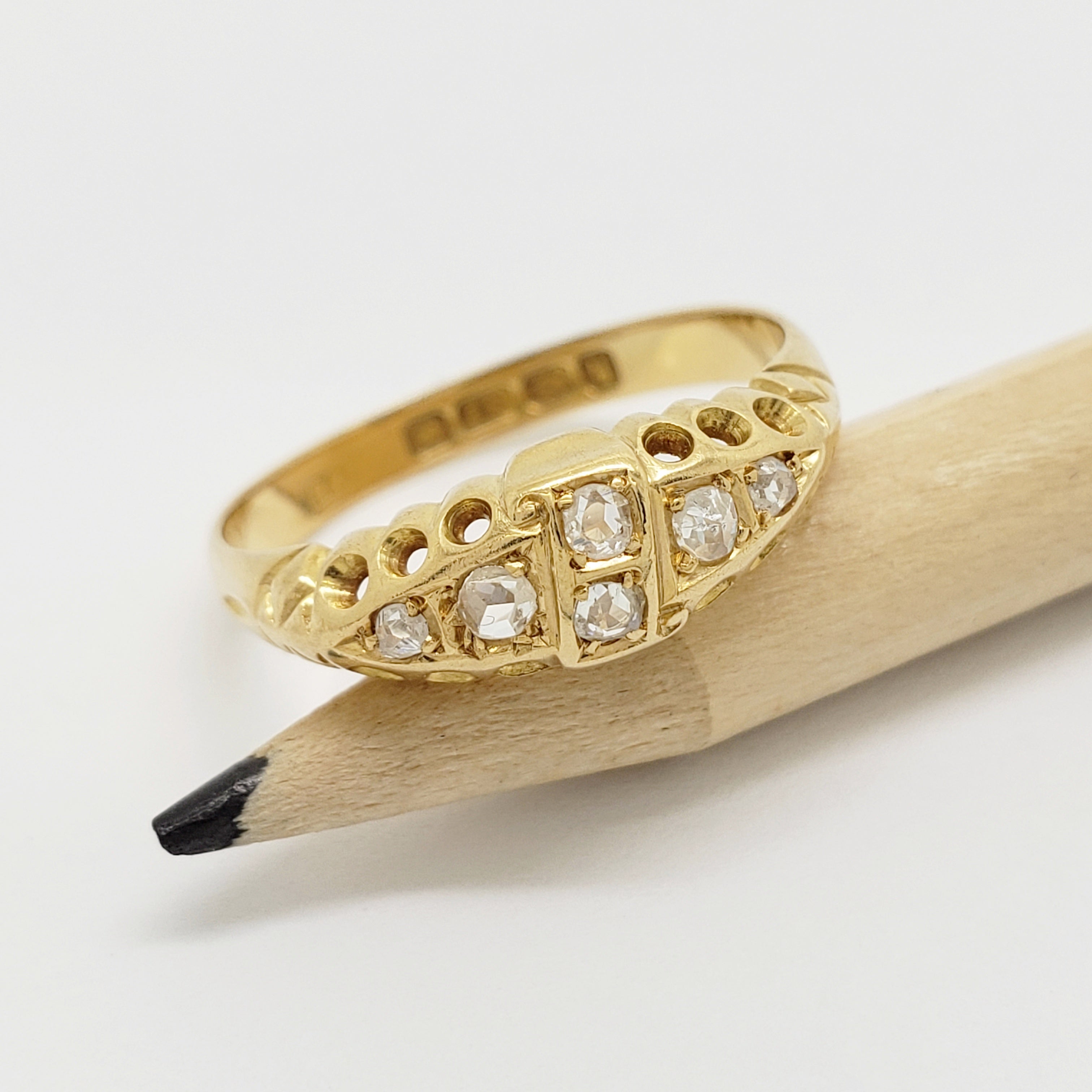 18kt yellow gold antique engagement band ring from the early 1900s, set with six sparkling diamonds.