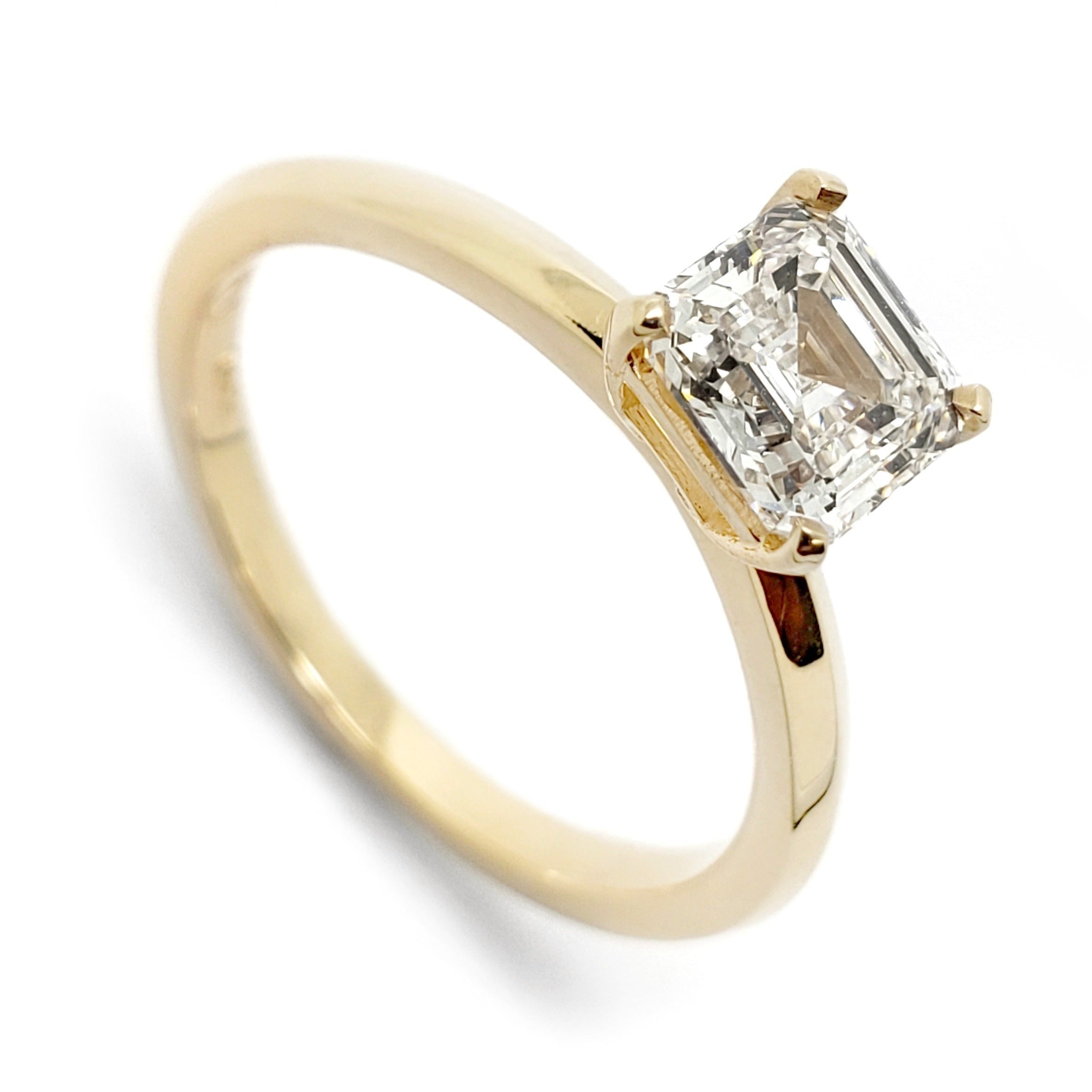 Handcrafted 14kt yellow gold engagement ring set with a 1.10ct asscher cut lab grown diamond in a simple solitaire setting.