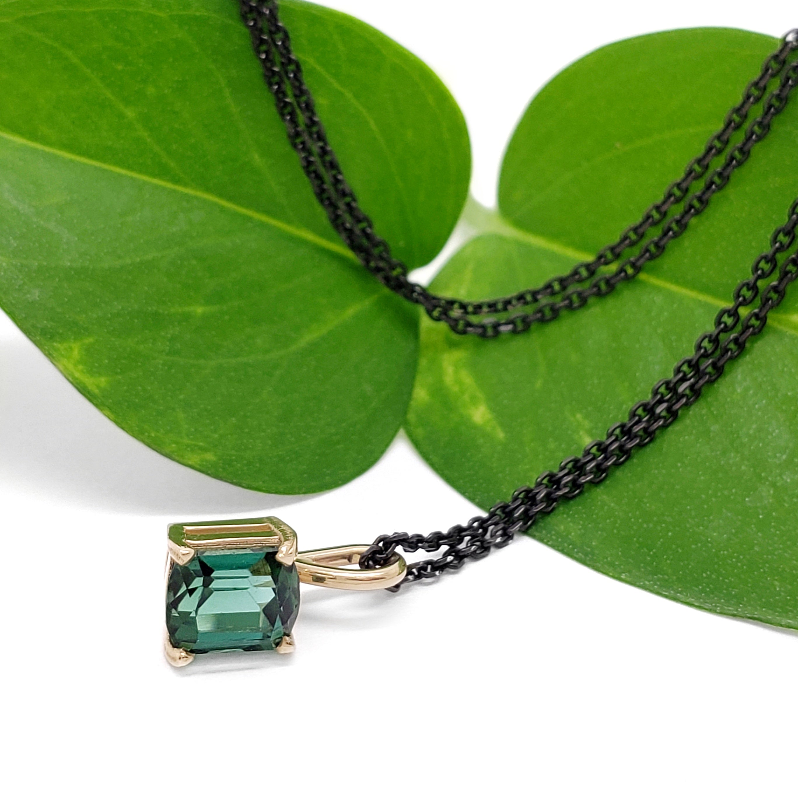 Handcrafted 14kt gold custom pendant with a unique barrel cut deep green tourmaline.