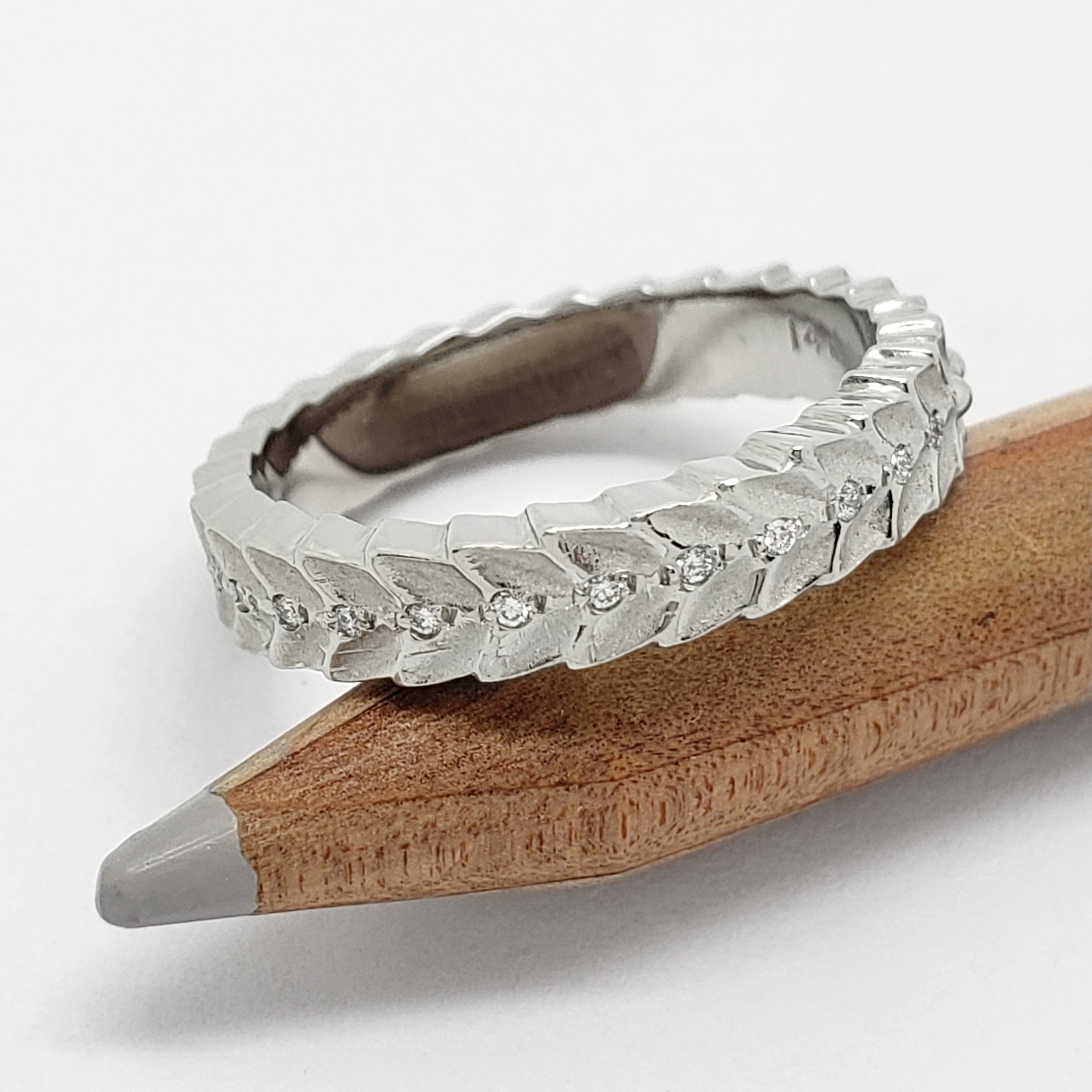 Diamond Nell | Handcrafted 14kt white gold leafy wedding ring with Canadian diamonds.