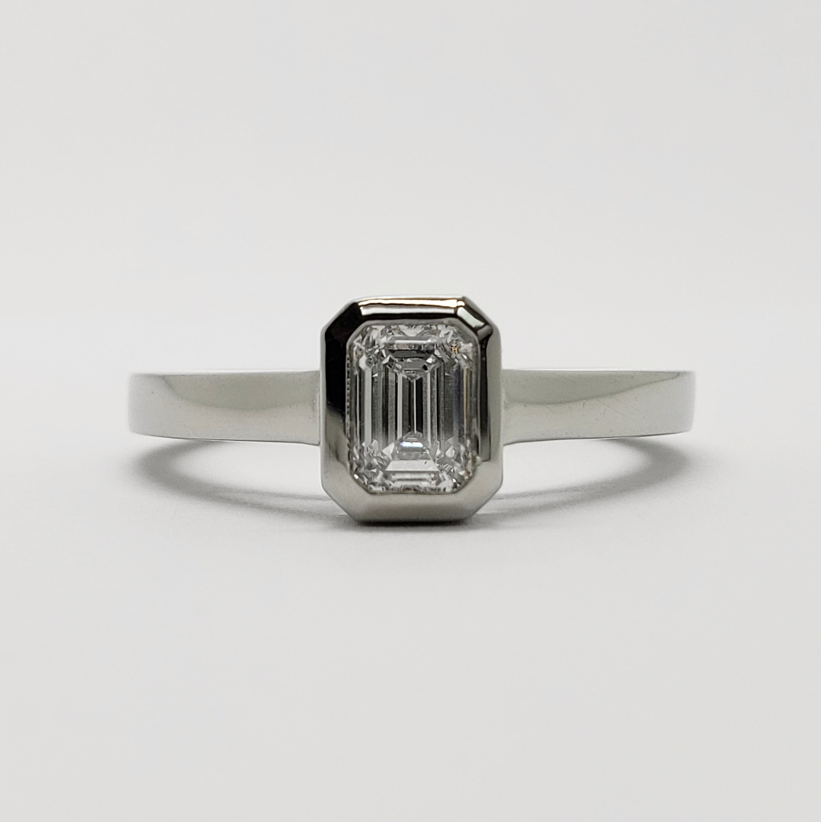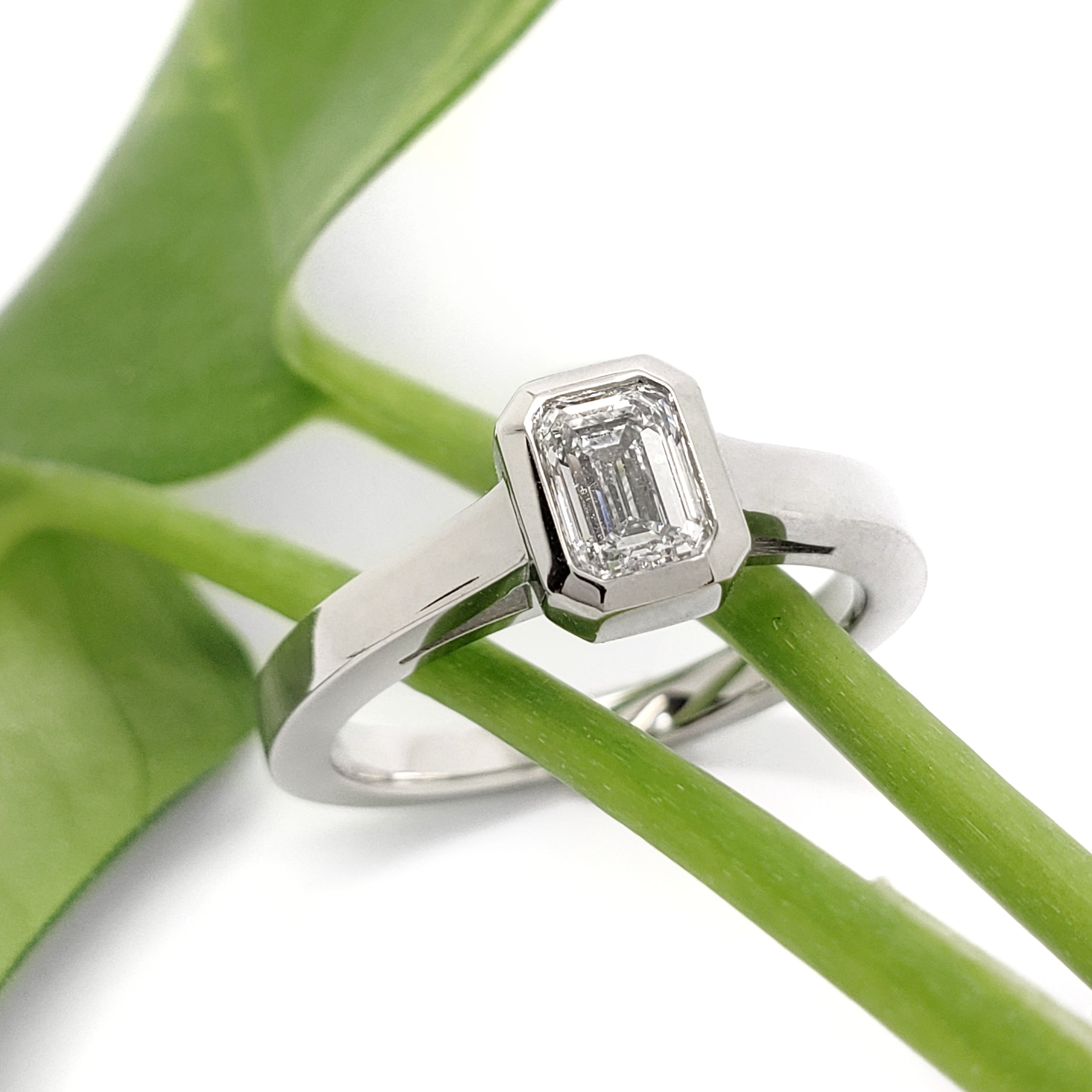 Handcrafted 14kt white gold ethical engagement ring with a 0.50ct emerald cut lab diamond in a simple, high bezel setting. This beautiful ring is designed to fit a straight wedding band next to it, creating a perfect pairing.