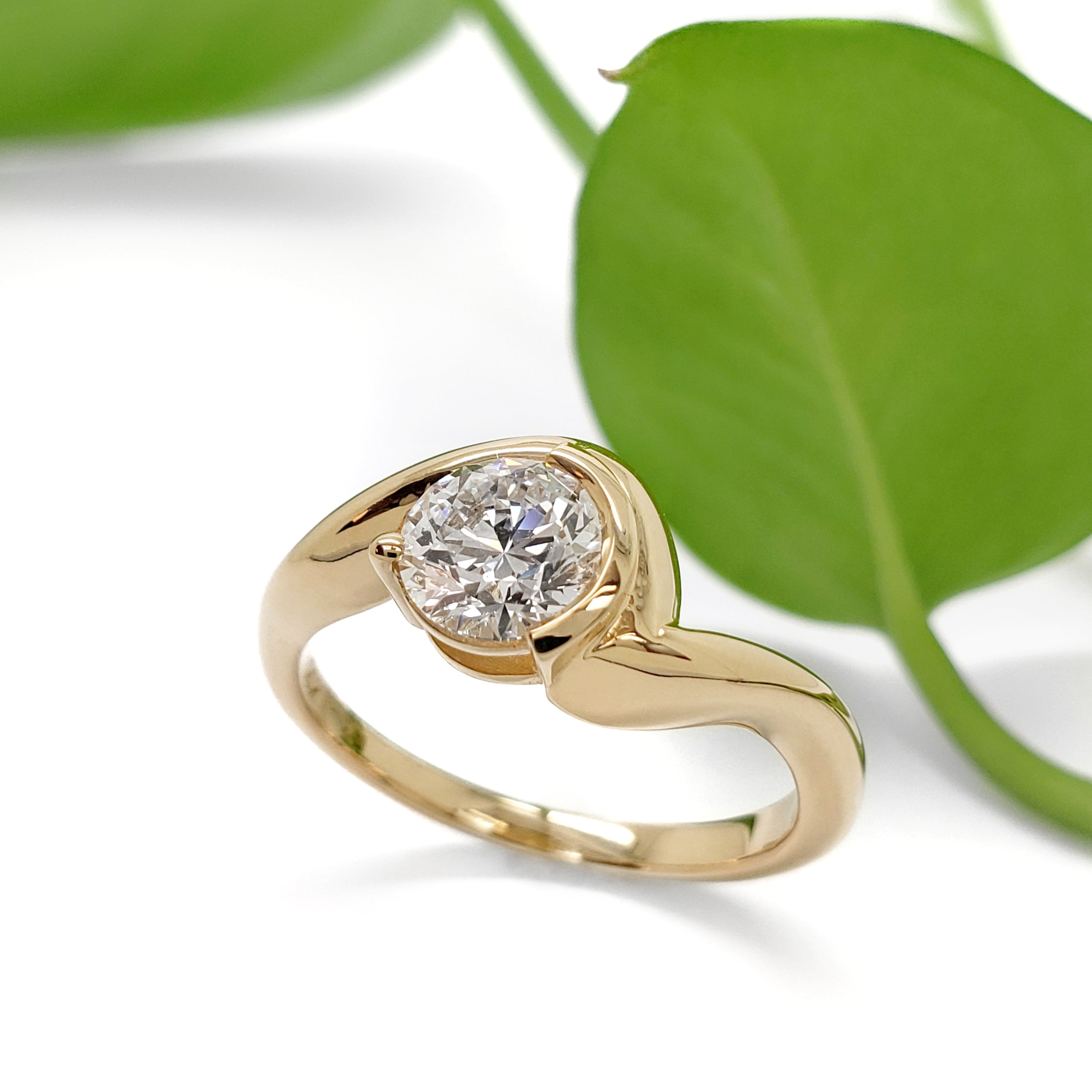 Inspired by waves crashing in the ocean, this handcrafted 14kt yellow gold custom engagement ring is set with a 0.91ct round brilliant cut lab grown diamond.