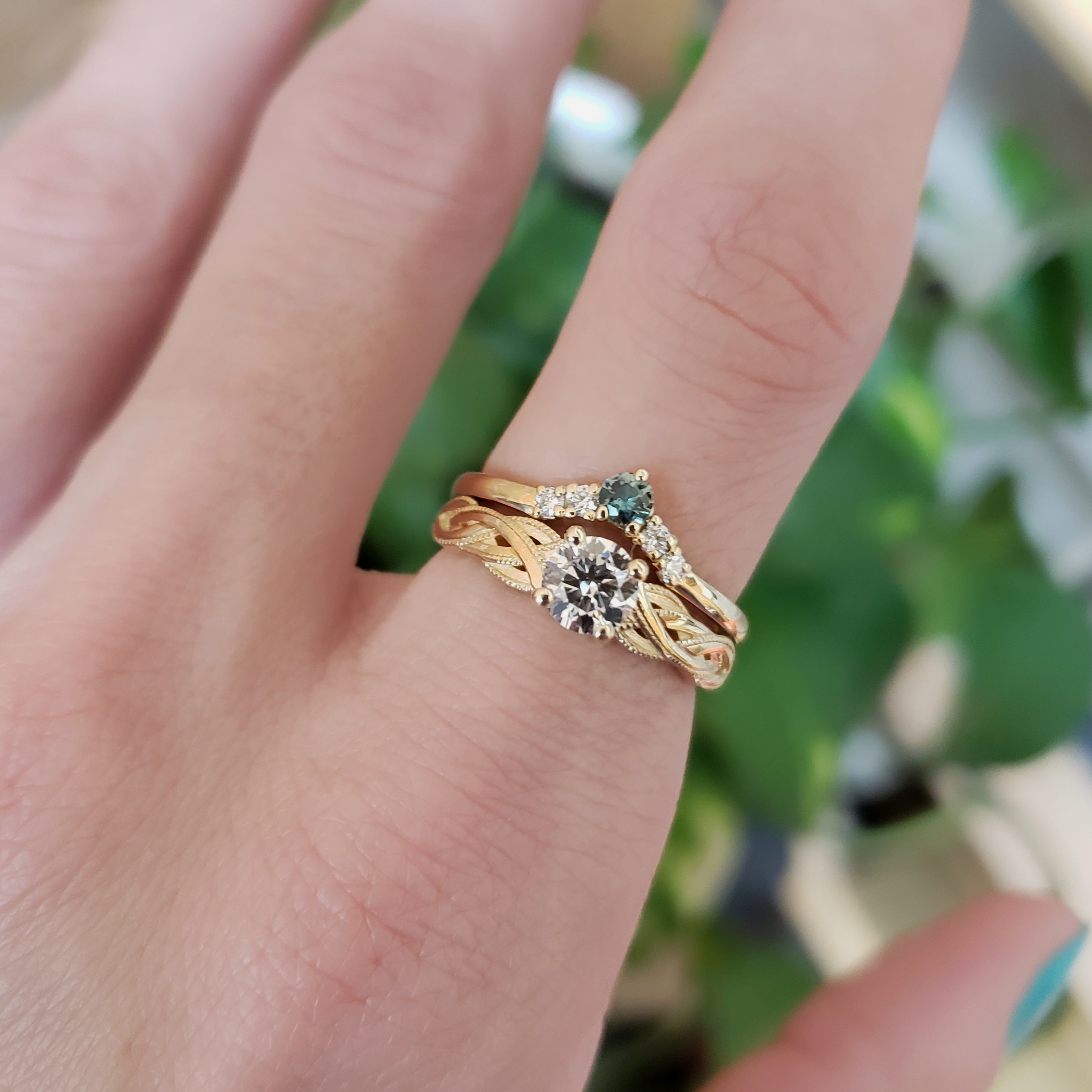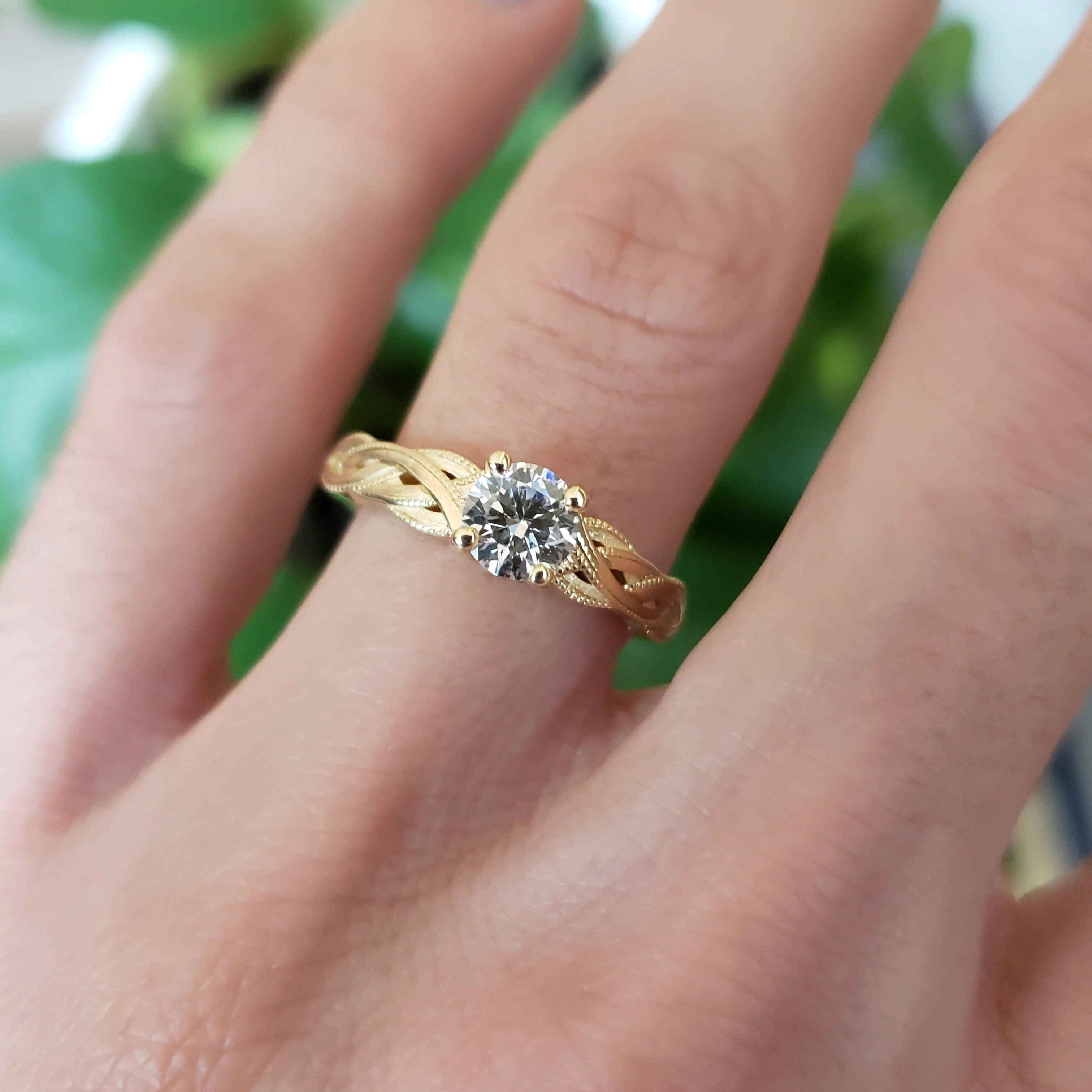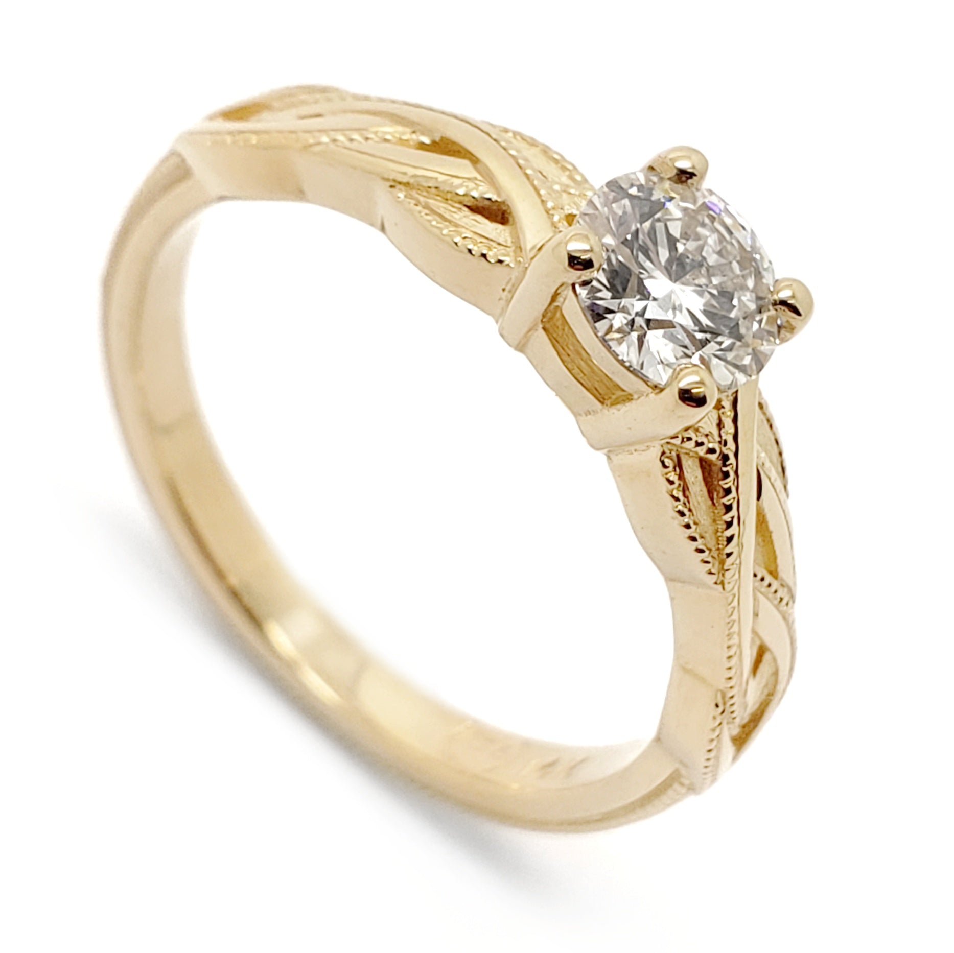 Handcrafted 14kt yellow gold ethical engagement ring with a 0.51ct round brilliant cut lab grown diamond. This unique engagement ring is high polished and features beautiful millgrain detail throughout the woven design and around the band.